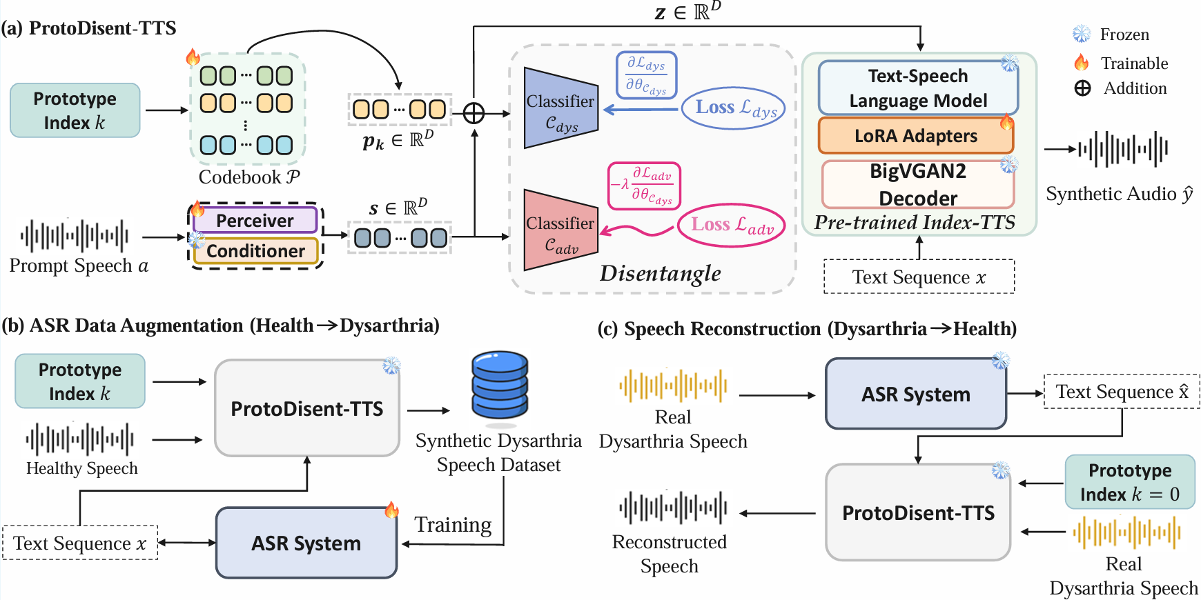 Abstract Dysarthric speech exhibits high variability and limited labeled data, posing major challenges for both automatic speech recognition (ASR) and assistive speech technologies. Existing approaches rely on synthetic data augmentation or speech reconstruction, yet often entangle speaker identity with pathological articulation, limiting controllability and robustness. In this paper, we propose ProtoDisent-TTS, a prototype-based disentanglement framework built on a pre-trained text-to-speech backbone that factorizes speaker timbre and dysarthric articulation within a unified latent space. A pathology prototype codebook provides interpretable and controllable representations of control and dysarthric speech patterns, while a dual-classifier objective with a gradient reversal layer enforces invariance of speaker embeddings to pathological attributes. This design enables bidirectional transformation between healthy and dysarthric speech, supporting scalable ASR data augmentation and speaker-aware speech reconstruction. Experiments on the TORGO dataset demonstrate that ProtoDisent-TTS is an effective framework for ASR data augmentation and dysarthric speech reconstruction.